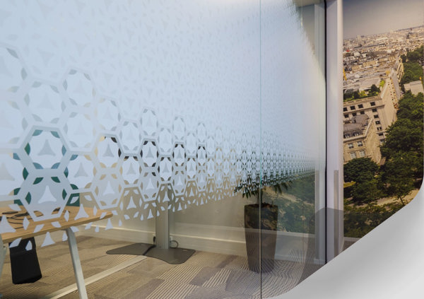 Bedrukt en onbedrukt (etched) raamfolie voor privacy en decoratie van kantoorruimtes